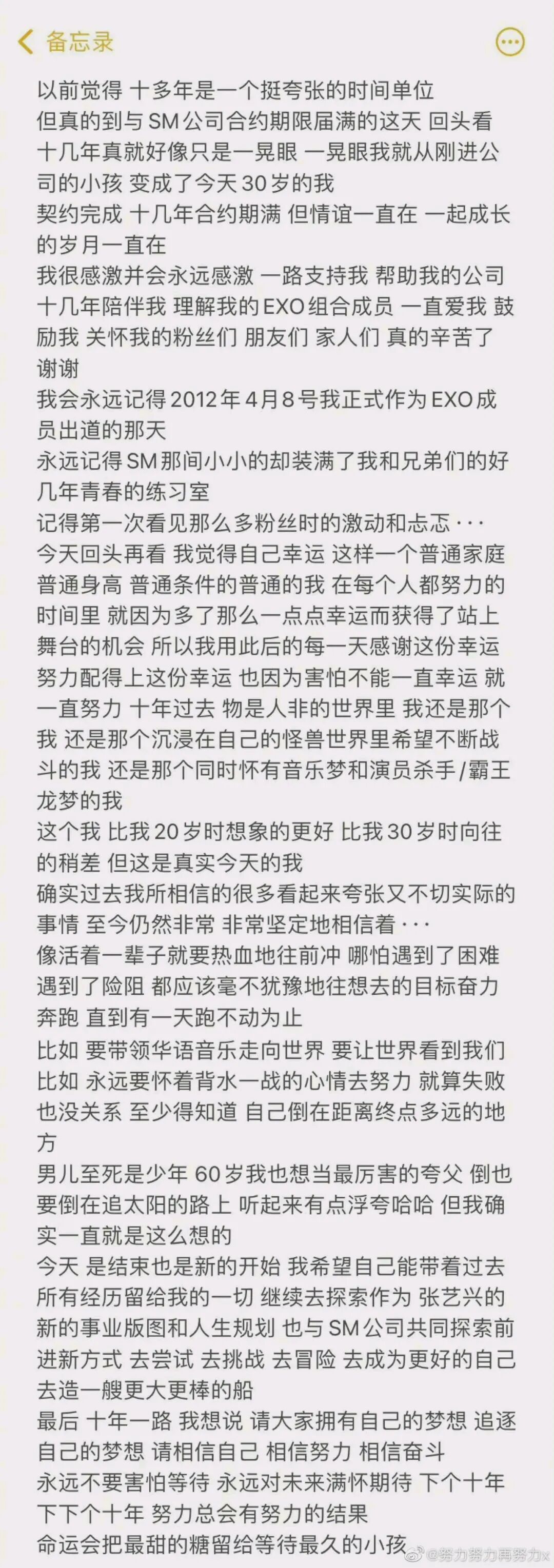 张艺兴在微博发长文,回忆EXO出道10年来的心路历程: