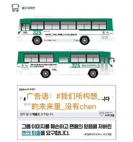 对于偶像“失格”向来是“零容忍”的韩国粉丝们包下巴士,车上标语为:我们描绘的未来没有CHEN, 要求损害组合形象、辜负粉丝信任的CHEN退出。