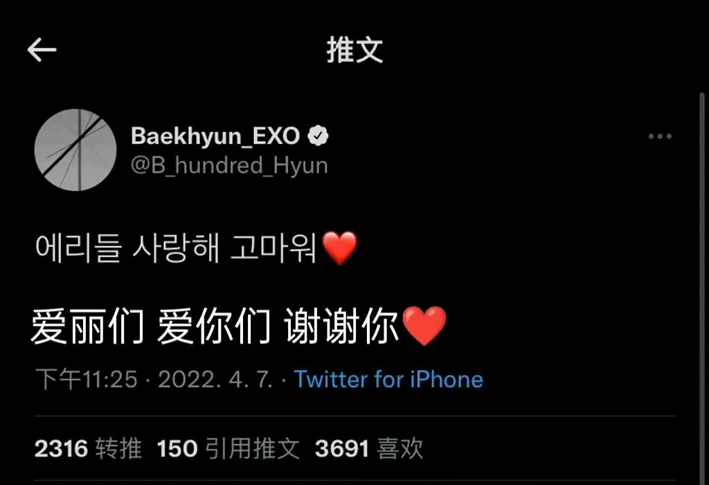 边伯贤发文感谢粉丝:爱丽们 我爱你们 谢谢你们!