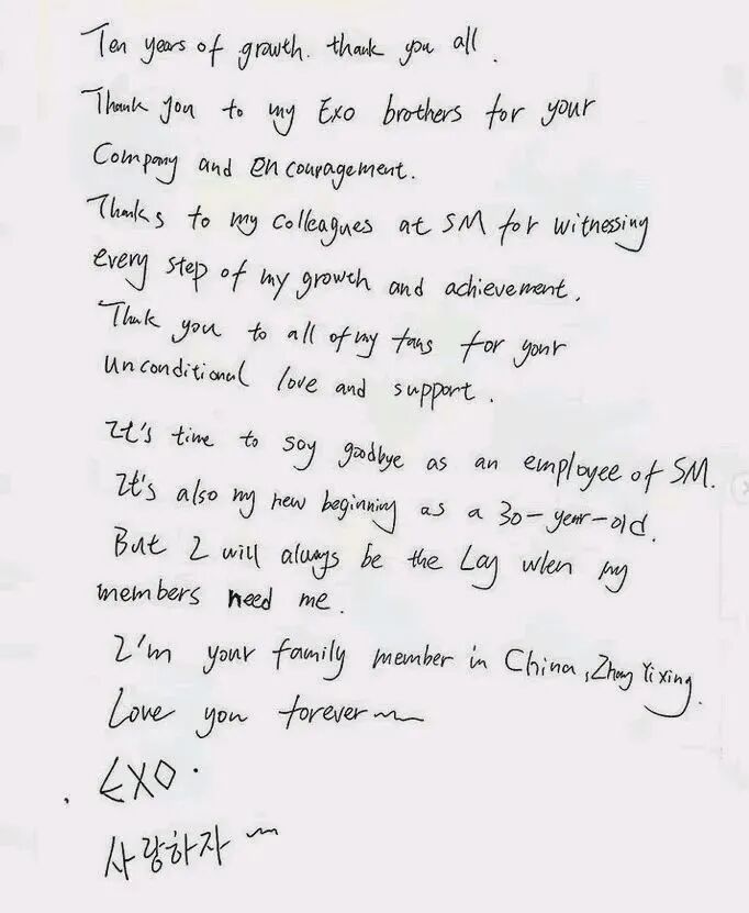中国籍成员张艺兴上传手写信,宣布与SM合约到期,将不再续约。感谢SM,感谢EXO,很爱很爱EXO!