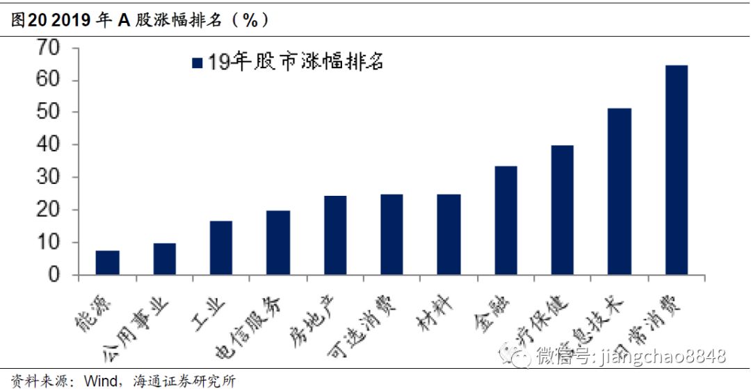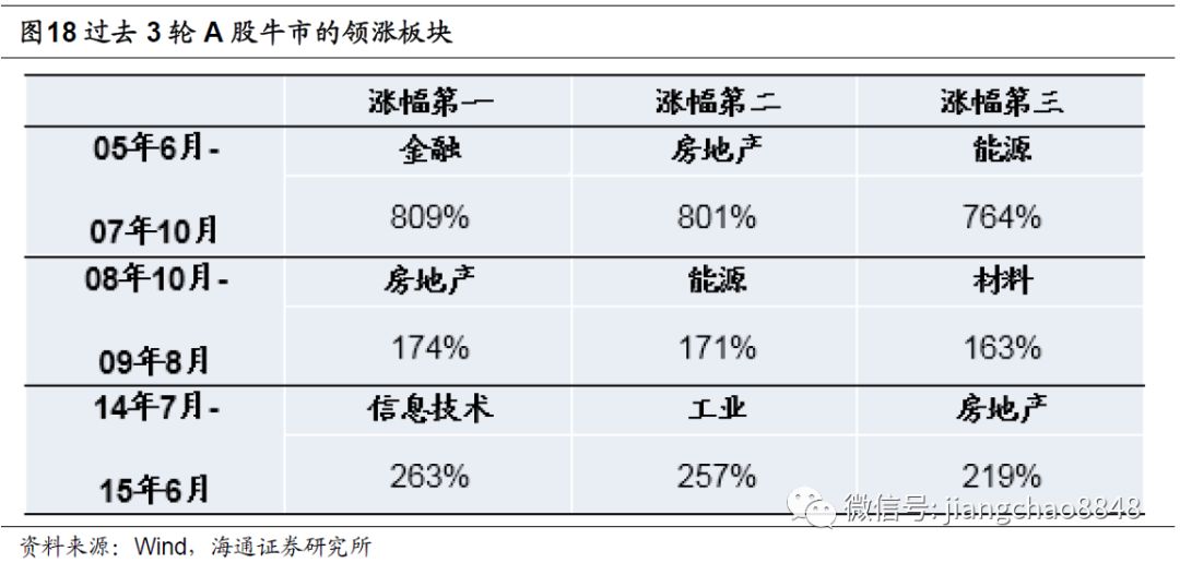 因而每一轮牛市都表现为周期行业领涨,09年牛市涨幅最大的三个行业是房地产、能源和材料,14-15年工业和房地产也排到涨幅榜的第三名。