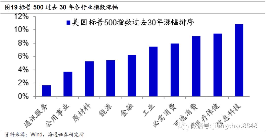 为什么美国的股票牛市已经持续了40年,而且目前还在继续?原因在于其经济不是靠货币驱动,而是靠消费和创新驱动。反映到股市当中,就是过去40年涨幅最好的四大行业分别是信息科技、医疗保健、可选消费和必需消费,全部都是消费和科技行业。