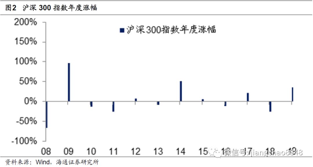 股市难得连续上涨。虽然2019年的股市表现非常不错,但是对于2020年,不少人依然信心不足,原因是中国股市的历史表现不太稳定,很少出现连续两年上涨。以沪深300指数为例,过去10年只在2014年和2015年出现过连续上涨,而且2015年的涨幅几乎可以忽略不计。历史数据表明,中国股市出现连续上涨其实是小概率事件。