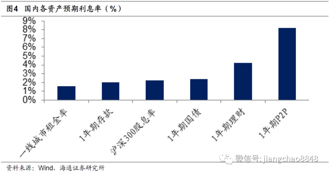 如果直接看各类资产的收益率,好像P2P是最高的,股票排第二,银行理财排第三,存款和国债排第四,而房地产排在最后。但是大家都知道,这个排序是很不靠谱的。一方面,这个收益率只是预期收益率,到期之后未必能够兑现。以股市为例,虽然沪深300指数的ROE高达12%,但是上市公司给大家的分红并不高,目前沪深300指数的股息率为2.2%,也就和存款利率相当。