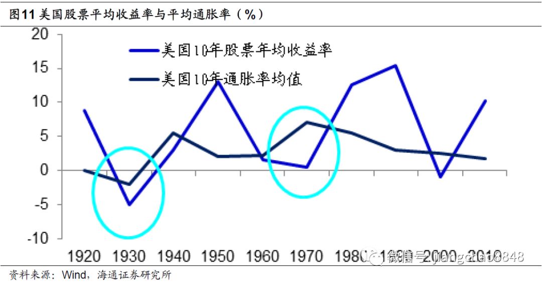 在1970年代,美国出现了高通胀,物价长期在10%左右。通胀高企导致了央行收紧货币政策,而利率上行使得美国股市的估值大幅下跌,整整10年美股都没有涨。而在1930年代,美国出现了通缩,物价长期是负的,这意味着企业的盈利每年都在下滑,没有盈利的支撑,股市也跌了十年。也就是说,无论通胀太高抑或太低,对股市都不是好事。