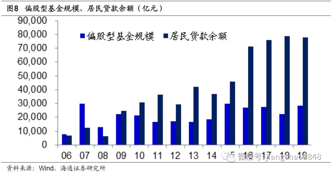 而且资金的流动会使得这一过程互相强化。根据我们的测算,2019年中国居民贷款总额预计会达到8万多亿,比2007年增长了近6倍。而在2007年中国偏股型基金的规模就达到了3万亿,直到2019年才重新回到3万亿。资金的持续流入进一步强化了房价上涨,而资金的持续流出使得股市长期不涨。