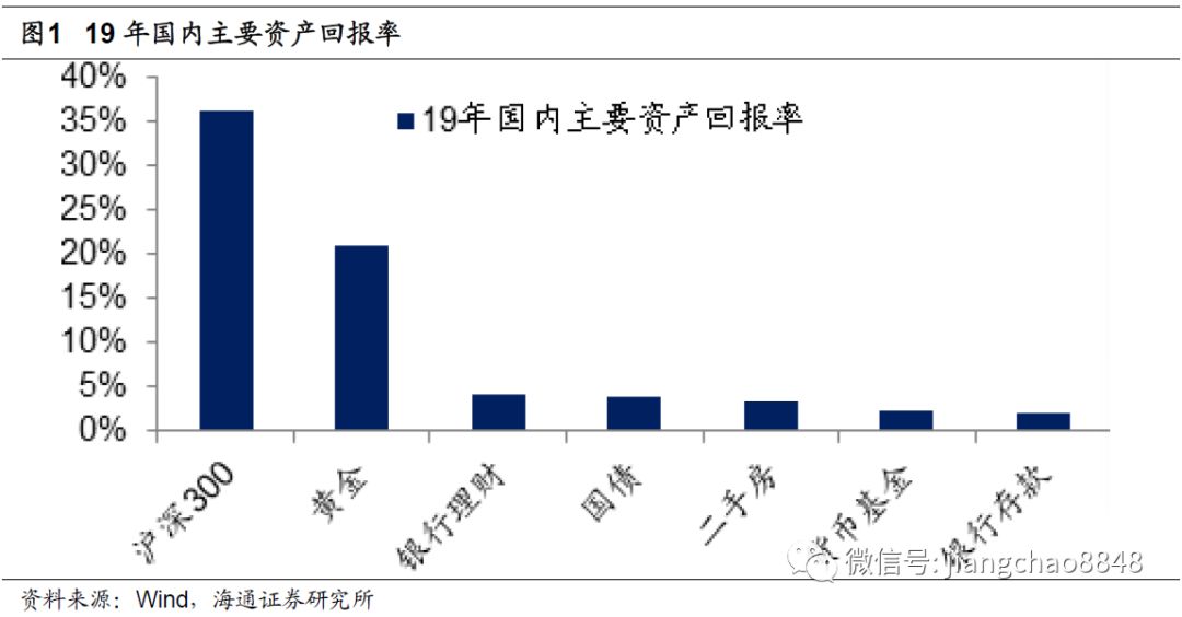 2019年股市大幅领涨。站在2020年初,回顾过去一年中国的各类资产价格表现,股市可谓是一骑绝尘,代表性的沪深300指数涨幅达到36%,这也是过去10年中的第二大涨幅。银行理财和债券位居黄金之后,3个月银行理财平均收益率为4.14%,中债国债总指数上涨3.9%。房市表现位居第五,全国百城的二手房价格平均上涨3.3%。货币基金和银行存款位于房市之后,余额宝平均年化收益率为2.36%;1年期银行存款利率为1.5%,上浮30%以后平均约为2%。而各种P2P排名最后,由于爆雷不断,很多投资人血本无归。