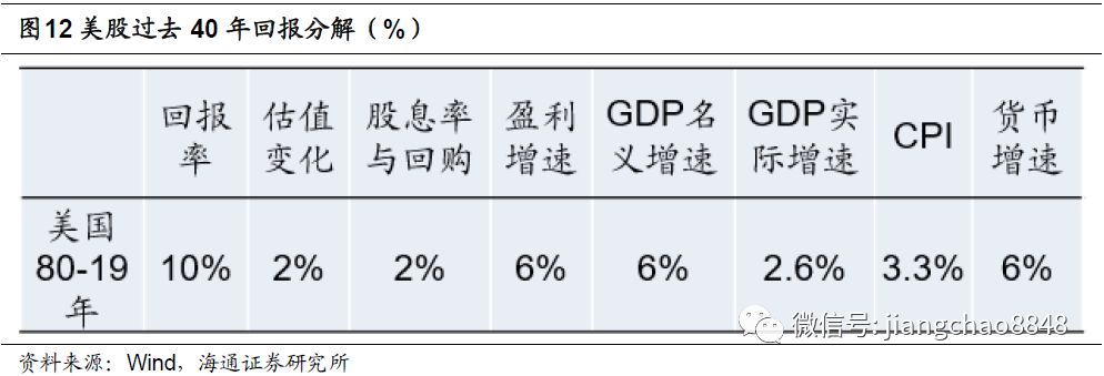 为什么温和通胀的环境下出现了股市的长牛行情?因为股市的估值稳定,同时业绩保持稳定上涨。我们可以简单分析一下:在过去40年,美国的通胀率平均大约是3.3%,这也是投资在股市中靠涨价所获得的回报;再加上2.6%的经济增长,合计贡献的回报率是6%,这也是美国同期的GDP名义增速以及企业盈利增速。此外,美国股市的股息率约为2%,加上去以后就是8%的回报。最后,由于通胀长期保持温和,央行不用紧缩货币政策,美国股市的估值水平在过去40年每年平均提升2%,再加上去以后就是10%的年化回报率。由此可见,温和通胀确实是最有利于股市长牛的环境。