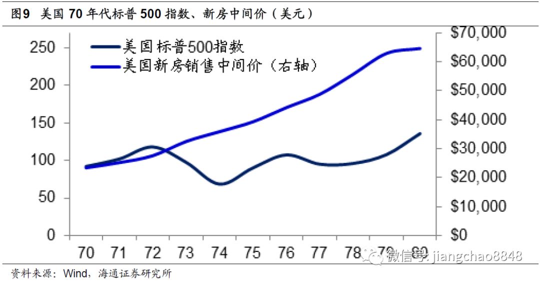 货币超发使得房产增值、股票贬值的故事不仅发生在中国,在美国的1970年代也曾经发生过。当时美国的广义货币保持在两位数增长,但是经济增速只有3%左右,货币超发产生了高通胀。而在高通胀的环境之下,房产成为最佳的保值资产,房价涨幅大致接轨货币增速。而高通胀引发了央行的货币紧缩,高利率使得股市估值大幅下跌,美股整整10年都没有涨。