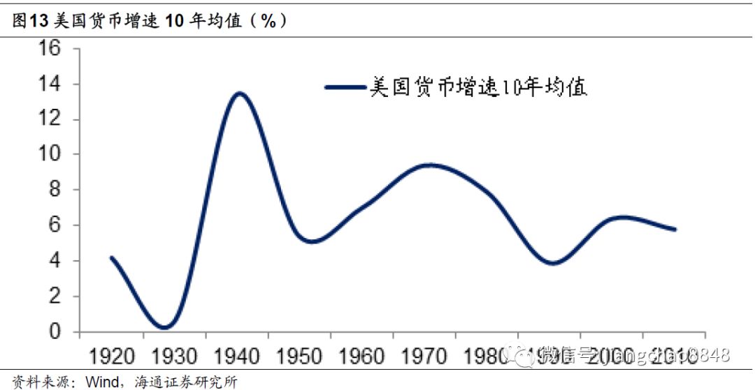 从货币与经济增长的角度,我们发现美国70年代之所以出现高通胀,是因为当时货币发多了,货币增速高达两位数,但是经济增速只有3%左右,货币超发产生了高通胀。而在美国30年代之所以出现通缩,是因为当时货币发少了,由于大萧条之后银行大量倒闭,使得货币消失了。