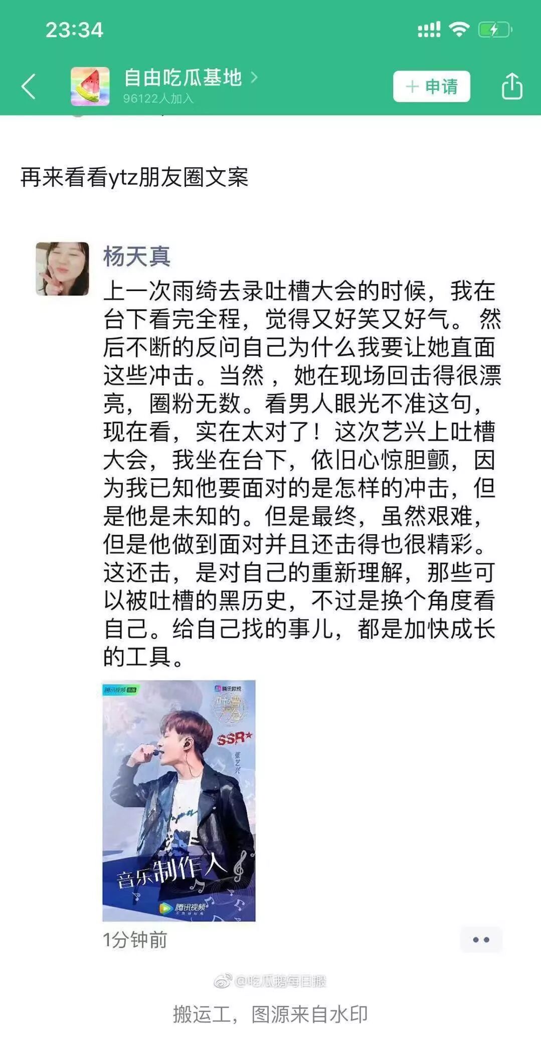 节目播出的时候,杨天真这边也发了朋友圈,对张艺兴去《吐槽大会》做了一个解读。