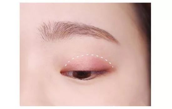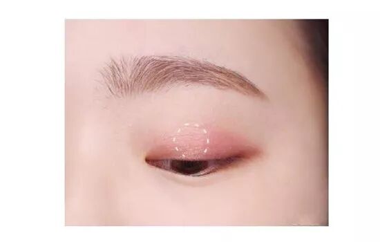 Step1:用带细闪的桃花色眼影上在眼窝处,从眼尾到前眼角的方向轻轻的涂上,注意在眼尾部分涂的比前面稍微深一些。