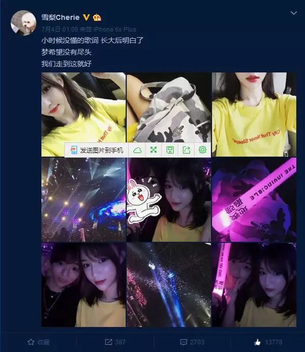 雪梨7月4号发的的微博,如下:小时候没懂的歌词长大后明白了