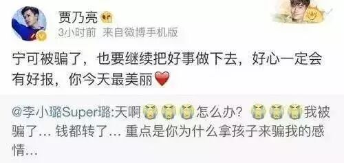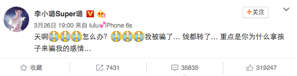 这时候李小璐才反应过来,自己是被骗了,并且发微博:“天啊,怎么办?我被骗了…”