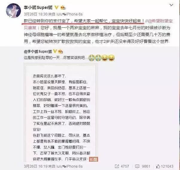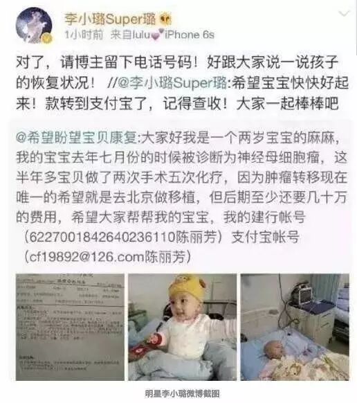 2016年3月26日,网友@希望盼望宝贝康复 在微博上给李小璐留言,称自己是一个两岁宝宝的妈妈,希望李小璐能转发扩散救生了重病的宝宝。