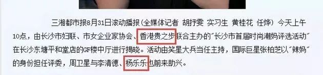 三湘都市报的一篇题为《张柏芝当评委现身长沙至潮五星辣妈揭晓》的报道中也提到,在香港贵之步与长沙市妇联、市女企业家协会联合主办的活动中,杨乐乐也前去参加。