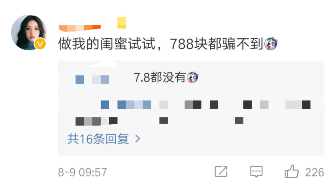 还有小伙伴表示,做我的闺蜜试试,连788块钱都骗不到,可能连7.8元都没有。这么想着,叉仔还有一点点伤感呢(哭