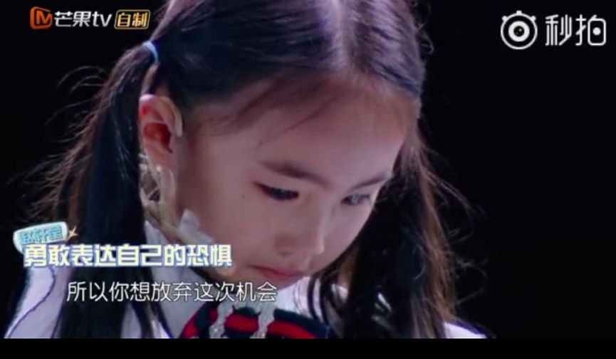 综艺节目《童言有计》中,Amy赵轩莹不敢摸恐怖箱里的东西,但又怕妈妈对她失望,急得眼泪都要下来了。