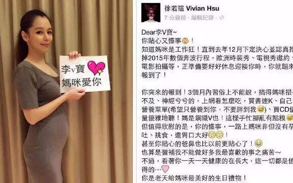 6月7日,徐若瑄在放出自己卧床图片,并为自己打气,“小V宝,妈咪每天都以食物逆流、脑充血之姿在加油、妈咪知道你一定也很努力!!!虽然不容易,但我们可以的!!”