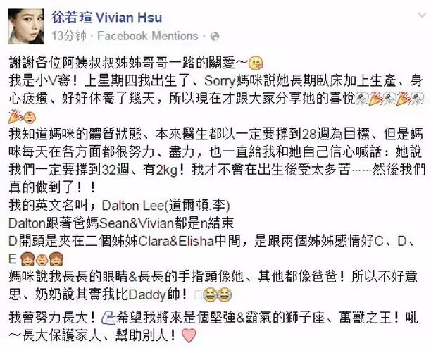 据悉,Vivian打算亲喂母乳至少半年,给小baby母体最好最天然的营养补给之外,因长期卧床的双腿也需要一些复健训练,所以因怀孕暂延的原广告代言及新的演出工作邀约等安排,Vivian预定明年三月以最好状态恢复正常工作。