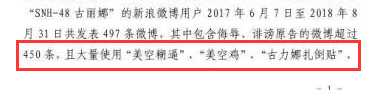该名造谣古力娜扎的网友是于2017年开始造谣娜扎的,在微博上发布了大量侮辱造谣娜扎的内容,总量达到450条,包括了一些美空糊逼、美空鸡等侮辱性词汇。