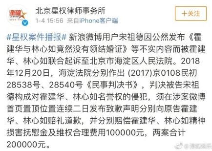 还有林心如上诉宋祖德也算一桩,当年宋祖德造谣林心如和霍建华没有结婚证,林心如逼婚霍建华,