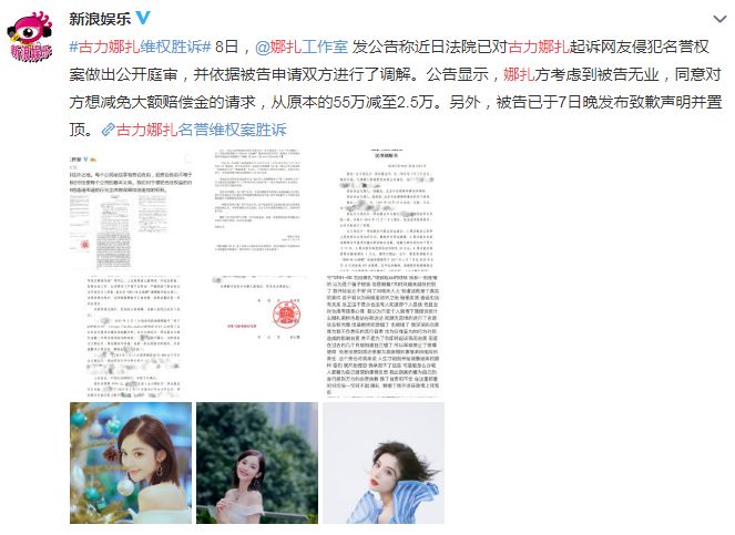 古力娜扎起诉网友侵犯名誉权公开庭审并胜诉,根据被告申请的双方调解,最终娜扎方考虑对方无业,同意减免赔偿金,从原本的55万减到2.5万,被告方需发布道歉声明置顶。