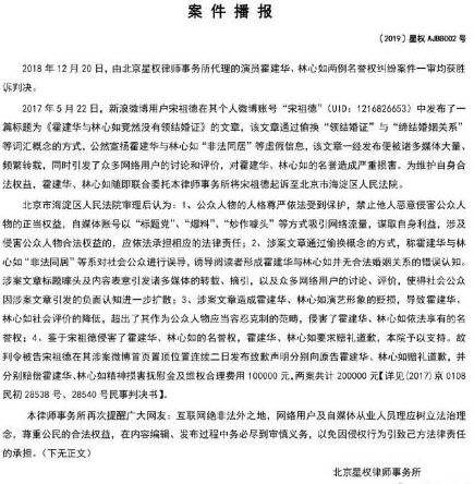 但经过林心如和霍建华的分别上诉,法院近日已经做出裁定,判宋祖德罚款200000元,并对林心如霍建华进行道歉,