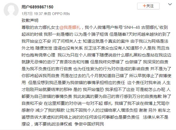 因为内容过于下流,给娜扎的生活和工作带来了很大影响,娜扎就起诉了该名网友,而改名网友的代价是原本要赔偿五十万,但最后改成两万五,同时还需要在微博发出道歉声明,