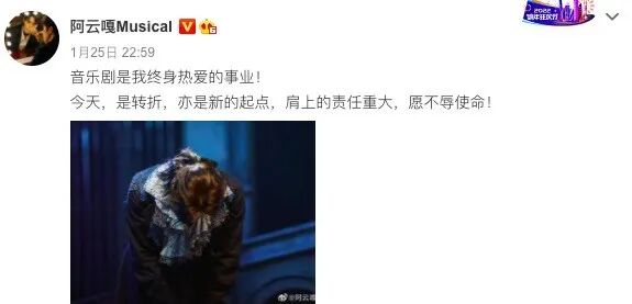 1月26日,阿云嘎受聘成为北歌音乐剧团团长,他在社交平台晒照并发文承诺:“音乐剧是我终身热爱的事业!今天,是转折,亦是新的起点,肩上的责任重大,愿不辱使命!”
