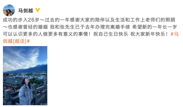 1月26日,辩手马剑越在自己26岁当天当天宣布离婚。她表示自己和张先生已于去年办理完离婚手续。言语平静,最后仍不忘表达美好心愿,给大家送上祝福。