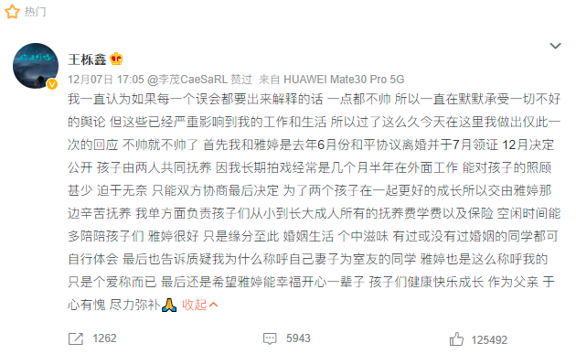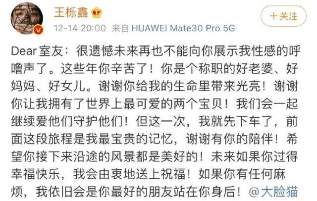 当时发布离婚声明时,把前妻夸了一通“好老婆”、“好妈妈”、“好女儿”,然后要表示:这一次,我就先下车了。