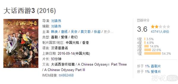 电影最后总票房是3.61亿不算差,但电影的口碑却并不突出。《西游3》豆瓣评分位3.6,和经典版的9.2比相去甚远。