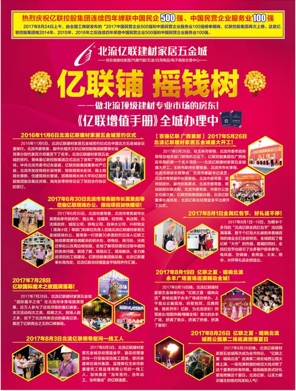 8月24日,万众瞩目的“2017年中国民营企业500强发布会”在济南顺利召开,2017年中国民营企业500强、中国民营企业服务业100强榜单正式出炉。亿联控股集团再次入围榜单,位列中国民营企业500强第344位、中国民营企业服务业100强第88位,这是亿联控股集团继2014年首登百强榜以来梅开四度,连年上榜,彰显了亿联控股集团的强劲发展和整体实力!