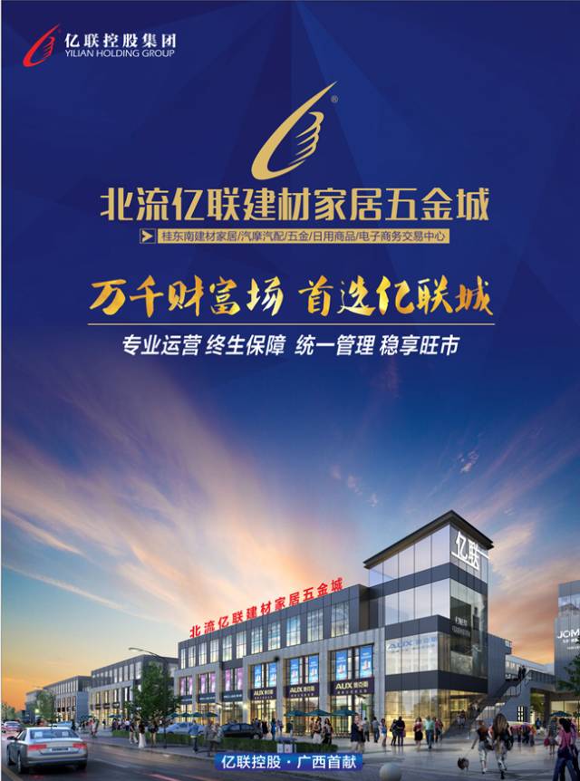 北流亿联建材家居五金城由中国民营企业500强亿联控股集团投资开发,是亿联控股集团进驻广西的第一座名片之城。本项目位于清湖路旁,总用地120亩,规划建筑面积12万方,计划投资达10亿元人民币。北流亿联建材家居五金城是一个集建材家居、汽摩汽配、五金机电、日用商品、电子商务、物流配送等于一体的桂东最为现代化、国际化、信息化的“一站式”复合型商贸物流中心。