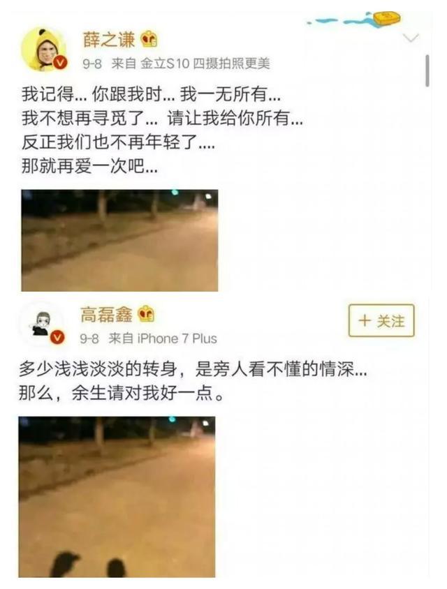 先一个一个来,故事的开端是属于薛之谦的,在9月8日的时候,薛之谦发了一条微博,宣布和前妻高鑫磊复合,本是一个好事情,可是接下来发生的,大家也都知道,前妻出来了,前女友也出来撕了。