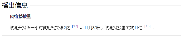二是,宣传时还有个数据:“播出仅一小时就轻松突破两亿。截止11月30日,该剧播放量突破11亿”