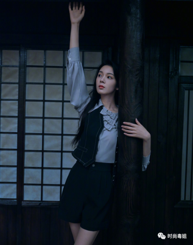 陈瑶这套私服look也很漂亮,虽说不同橘黑look那般有活力,但蓝黑搭配的时尚look,看起来低调优雅,同样不乏时尚气息;蓝色长袖衬衣作为内搭单品,黑色马甲外套,看起来很有层次感。