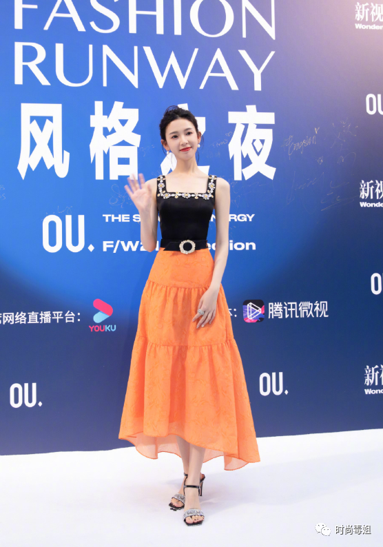 橘色是一种很有活力的色彩,总能轻松调动人们的感官,而这次陈瑶穿着一袭橘色连衣裙出镜,与黑色碰撞后,就迸发出另一种时尚感觉,活力四射尽显少女魅力。只见她穿着一袭背带裙出镜,上半身有点类似小背心的感觉,采用纯黑色为主基调,用白色刺绣花纹点缀,富有精致亮点;下面则搭配橘色半身裙,腰间系着黑色腰带束拢,扎起丸子头俏皮灵动。