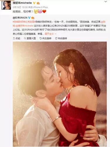 除此之外,陈妍希和陈晓替杂志拍摄系列照片中,其中一张2人躺在床上相互依偎,她闭眼背对男方、微微露出甜笑,而陈晓则是一手霸气熊抱未婚妻,让不少粉丝看完直呼“好浪漫”、“养眼登对的双陈”、“虐狗无上限阿”、“这恩爱秀得我喜欢”。