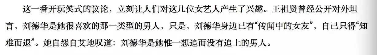 王祖贤曾经表示她喜欢刘德华,但是当时刘德华已经有女友,所以她不得已放弃了。