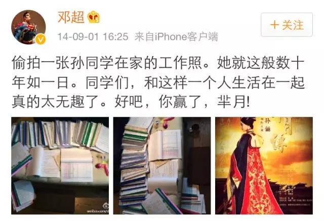 然而娘娘的辛苦和所付出的努力,也都是真真儿切切的。看看邓超发的这条微博,娘娘在家的工作状态是酱紫的。