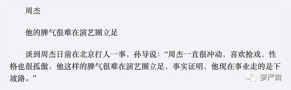 “我们不会再跟周杰合作了,他的表现令我们很失望。”制片人孙女士说,拍电视剧是个集体创作的过程,不仅要考虑如何塑造好剧本赋予的这个角色,同时也要注意与其他演员的合作。孙女士认为周杰过于自我,总是把个人喜好放在戏里,而且太顾及自己形象,既然签了合同,就应该做好自己的本职工作,演好这个角色,否则就无法合作。