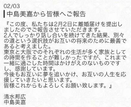 可一切又没有那么美好了,2月2日中岛美嘉在官网发表声明称,已经和清水邦广递交离婚申请书,结束3年婚姻。