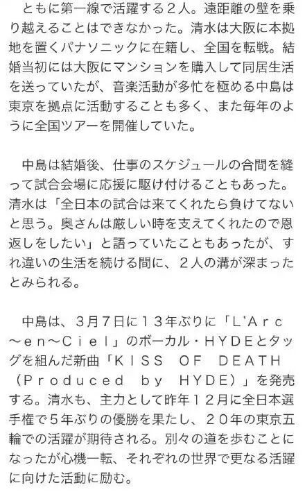 芥末酱找到2人早前的一段影像,因为工作关系已经有一段时间未有见面了,中岛美嘉偷偷的去看清水比赛,在赛后美嘉见到清水就飞扑上前,而清水则是一把抱住飞奔过来的老婆。(啧啧啧,当年的图片中弥漫着爱情的酸臭味)