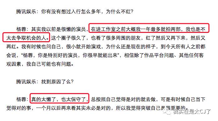 杨蓉自己反省过,问题还是在自己懒,一年拍两部,基本上是成名演员“养老”状态的量。