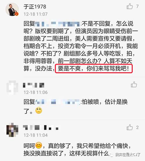 于正方面表示,杨蓉档期撞了,但是投资方不肯再等了,只能做此决定,粉丝如果不爽可以骂骂自己。