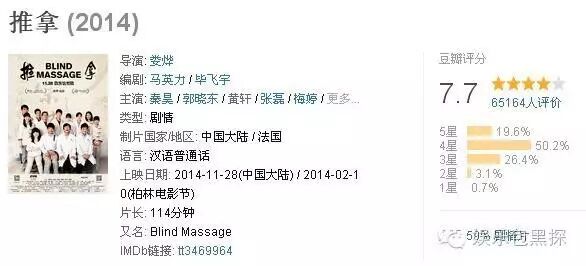 《推拿》7.7分 由于是男三号,虽然表演突出,但仍然不计算在内
