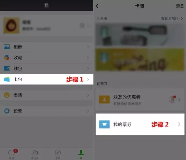 2、在微信【卡券】-【我的票券】中查看优惠券;