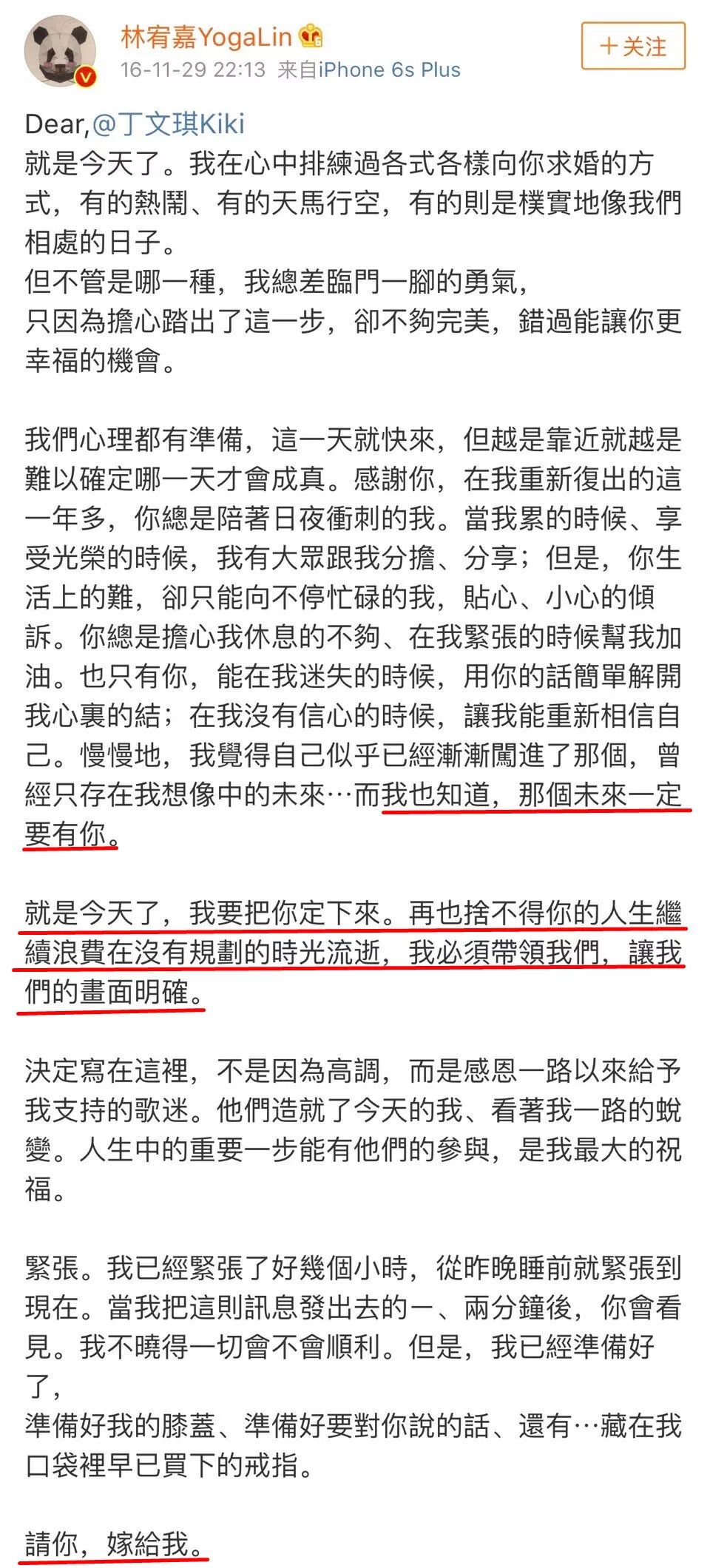 Yoga长文求婚,浪漫全微博